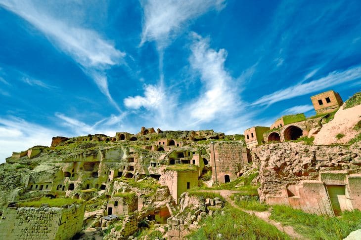 Vor Tausenden von Jahren überzogen Vulkane die Region Kappadokien mit einer dicken Lavaschicht. Durch Erosion und abfliessendes Regenwasser bildeten sich in der Folge bizarre Felsformationen aus Basaltstein, die teilweise eine Höhe von 45 Metern erreichen. Die Einheimischen nannten diese einzigartigen Gesteinsformationen «Feenkamine» – eine Bezeichnung, die bis heute überdauert hat. Doch nicht nur die Natur gestaltete die Region, sondern auch die Menschen. Sie begannen Häuser in die stabilen Felswände des Gebirges zu meisseln. Dabei entstanden ganze unterirdische Städte. Derinkuyu, die bekannteste Siedlung dieser Art, befindet sich rund 40 Kilometer südlich von Nevsehir. Acht bislang freigelegte Etagen mit Wohnungen, Speichern, Kirchen und Klosteranlagen gruppieren sich um einen 85 Meter tiefen Schacht eines ausgetüftelten Lüftungssystems. Hier sollen einst bis zu 20 000 Menschen Zuflucht gefunden haben. Zurzeit weist Derinkuyu eine Fläche von 1500 Quadratmetern auf, doch man geht davon aus, dass dies nur ein Viertel der Gesamtanlage ist.